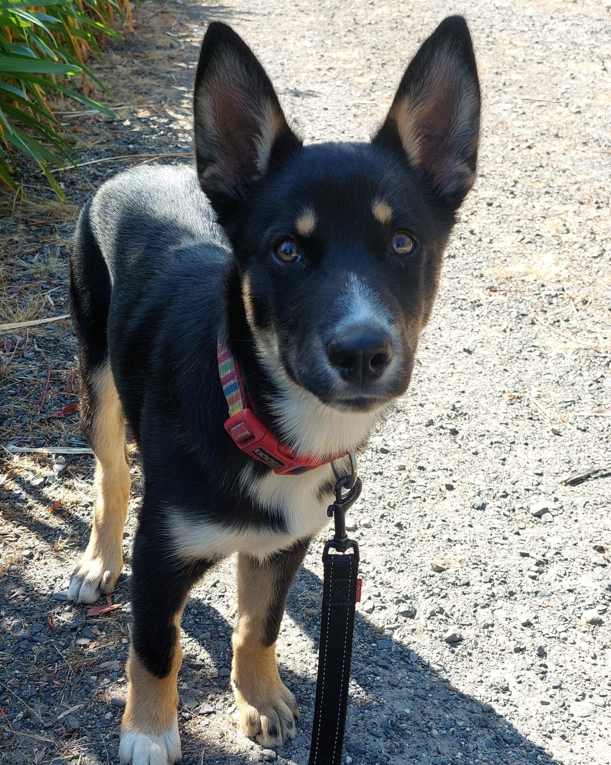“Lucky is a very lively, busy pup who is energetic and full of beans,” staff say of this Kelpie-Husky x. “He can be nervous initially meeting new people. He’s learning to walk on a lead and will need ongoing training. Luckily (!!!) he’s very eager to learn.”