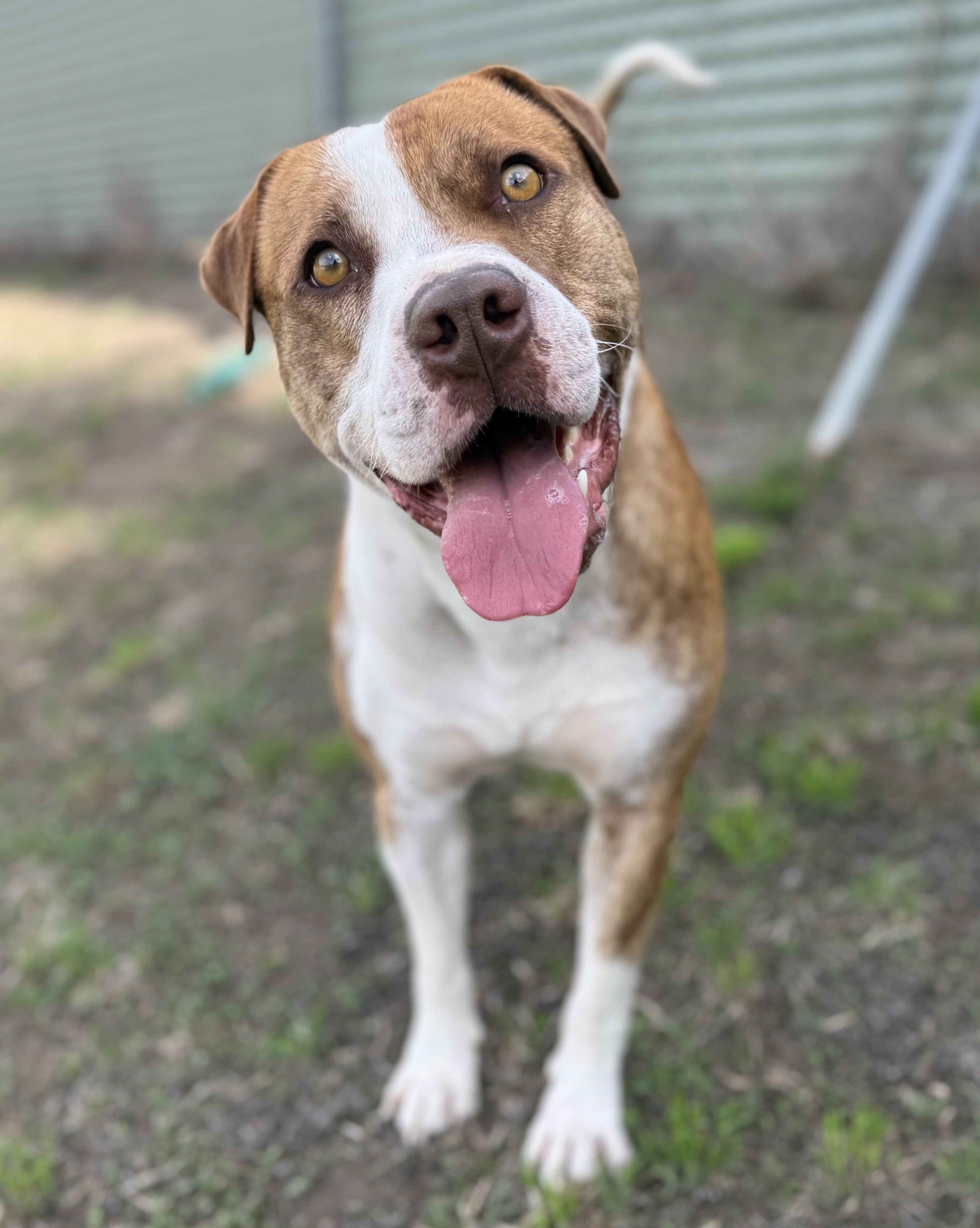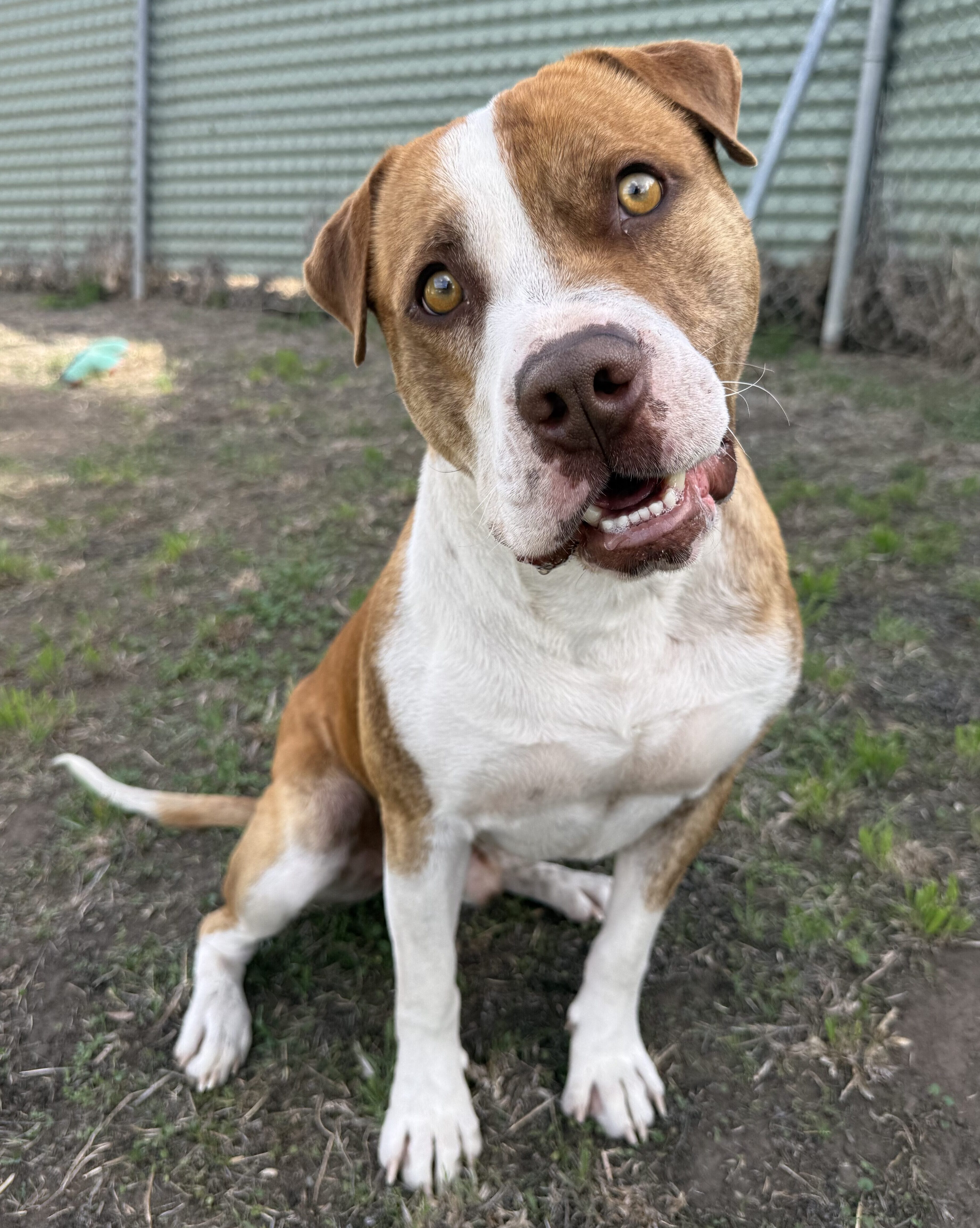 He was a stray so we don’t know anything about his background. He’s been in foster care where it was discovered that he enjoys playing with toys and chasing balls. “Ruckus has a playful side when he’s outside with his toys but then is more than happy to chill around the house,” staff say.