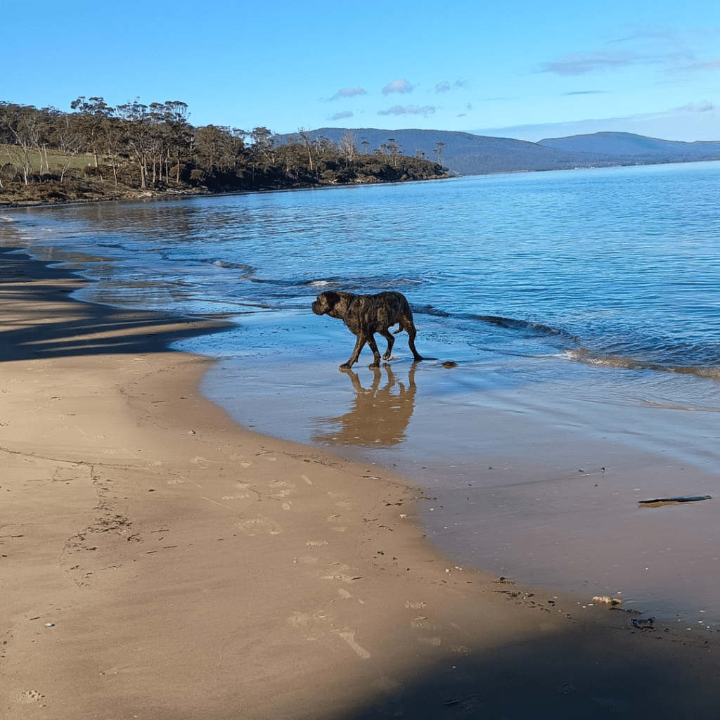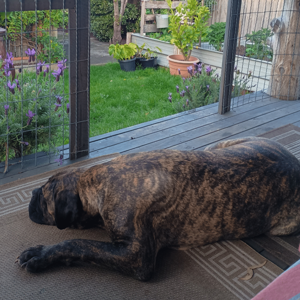 “We are out and about a lot, walking in the bush, at the beach, or riding in the car doing errands. He loves his yard and I will often find him out basking where he can find sun. And bones are the best. Tiger is a great sleeper and loves his bed and the couch. He literally makes a purring sound when ‘tucked in’!